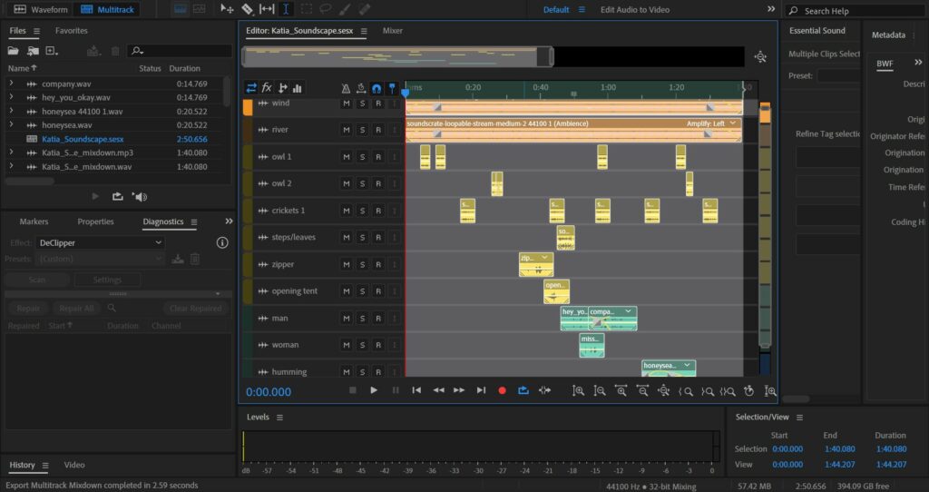 For this final project in Unit 1, we were required to create either a soundscape or a podcast. I chose to create a soundscape and create a sense of space around camping. Initially, it was going to be based around fun times with friends while you camp next to a river and tell stories or sing songs. For some reason, I decided to change that to have a bit more of a calm or sad tone. The soundscape turned out to be based around 2 friends or a couple. They fell asleep in their tent but the girl got out to get fresh air and stargaze in silence. The man wakes up and sees she is outside and decides to join her because he is worried she might be a bit sad. I was going to add the sound of a crackling fire in the ambience, but with the wind and the river, the fire made the composition sound too busy. I really wanted to record the sound of crickets myself, but apparently, the cricket season is over and I couldn’t find them anywhere! This project ended up being a lot of fun and I hope it communicates what I want it to.