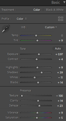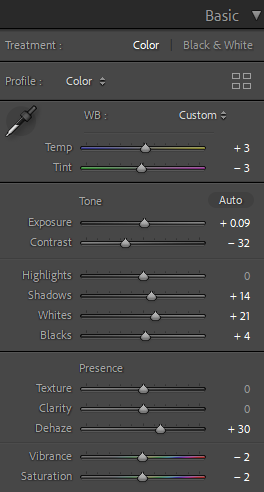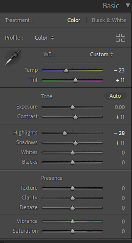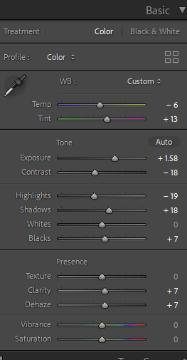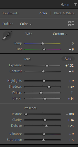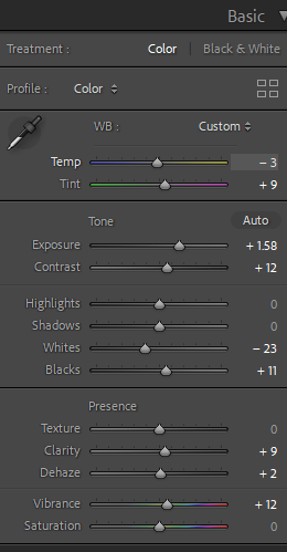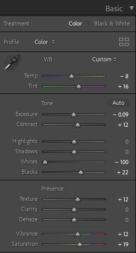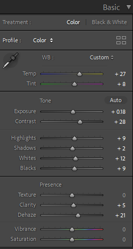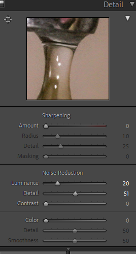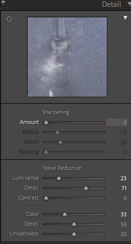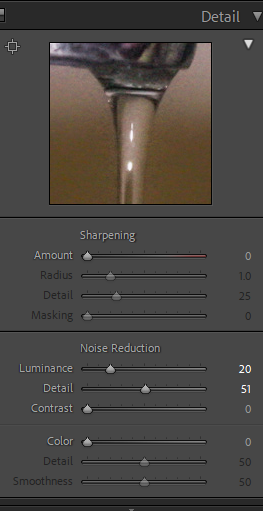 Most of the edits for the indoor photos involved white balancing and tinting to remove the very warm tone most of them had. I had to increase exposure and play around with luminance and color for noise reduction since some of the images had high ISO due to the low light in my apartment and the fact that I needed to use a faster shutter speed to capture the droplets and ripples of water in my images.