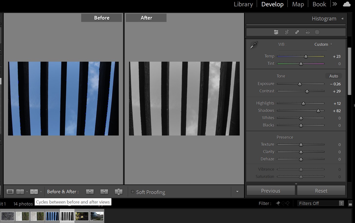 Most of the pictures I took all looked the same, with the only variation being lighting depending on the exposure I gave it. Some of them ended up looking better underexposed, like the image for scale. I changed the pictures for shape and color because they looked a little dull and I wasn’t entirely convinced they were representing the elements properly. In regards to editing, for most of the images, I just wanted the colors to be more vibrant and the details to be clearer. For the image representing value, I assumed it would be better to showcase the gazebo’s ceiling and the sky in a black-and-white edit. The image for texture is just a concrete floor near the entrance to my building and the image for shape is a pipe cover or lid. My favorite image is the one for line. I played around with symmetry and wanted it to look a little more somber than the rest of the images.